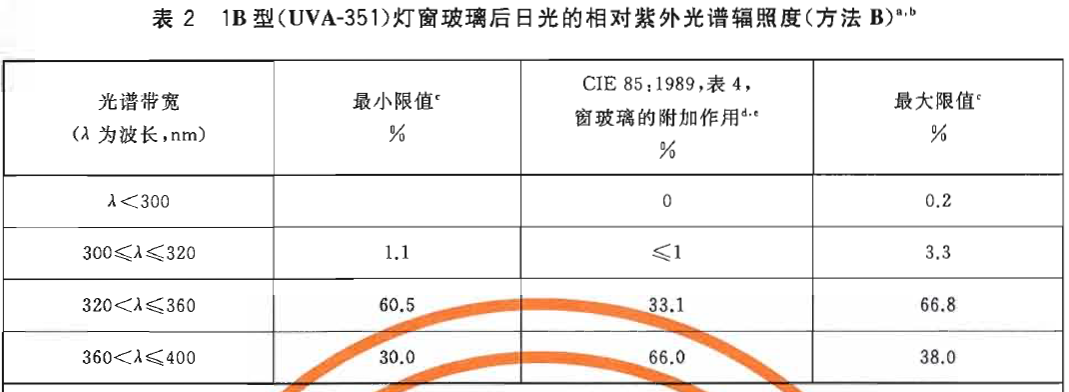 1B 型(UVA-351)熒光紫外燈:這種燈在300nm下的輻射低于總光能輸出的2%,在353nm有發(fā)射峰,用來(lái)模擬經(jīng)窗玻璃后日光的紫外部分,這種燈通常被稱(chēng)秋UVA-351(見(jiàn)表2)。附錄A中的圖A.2為250nm~400nm下典型的1B型(UVA-351)熒光燈對(duì)比經(jīng)窗玻璃過(guò)濾后日光的光譜輻照度圖。2型(UVB-313)燈可在相關(guān)方協(xié)商同意下使用,但協(xié)商意見(jiàn)應(yīng)在試驗(yàn)報(bào)告中指出。